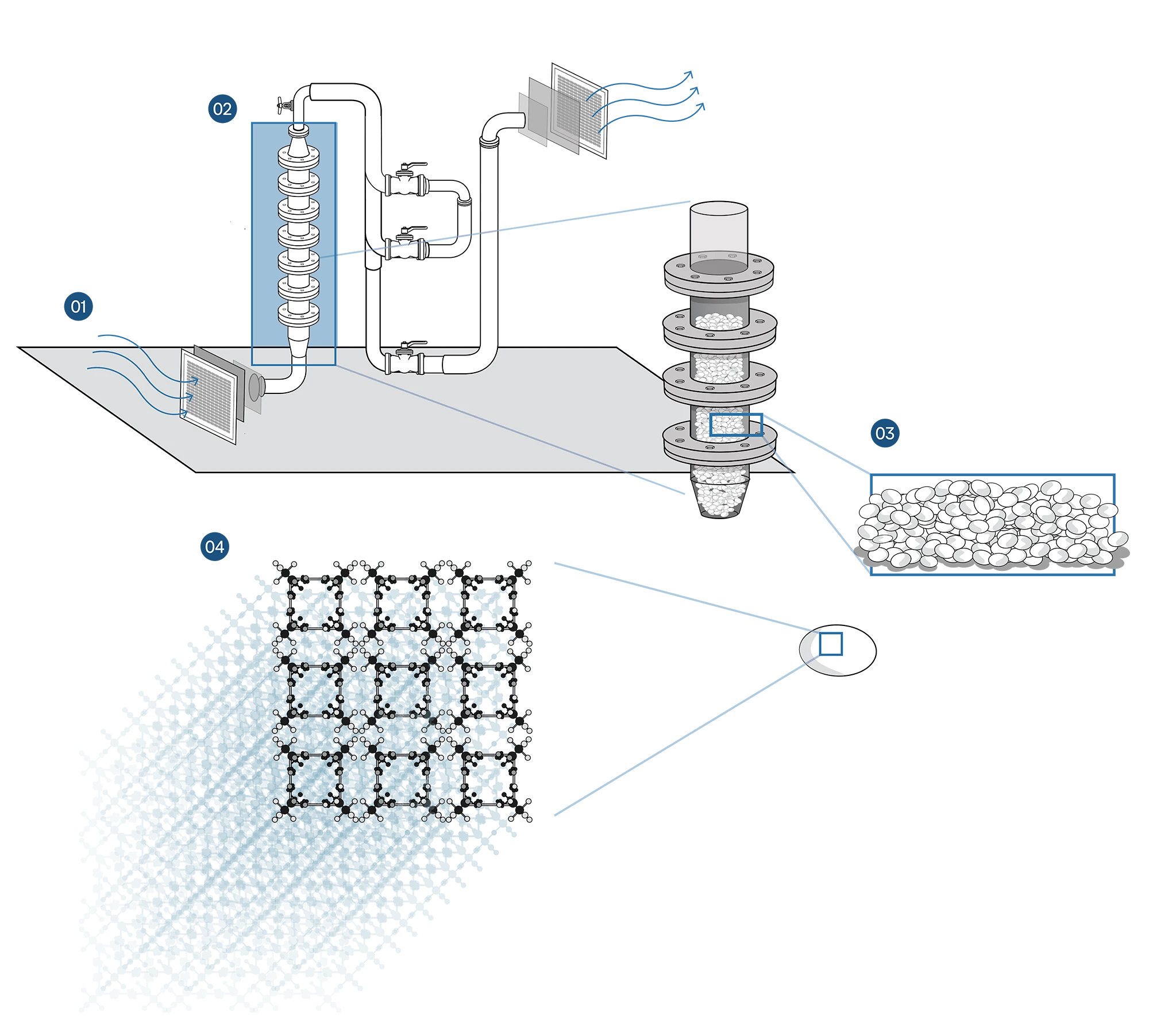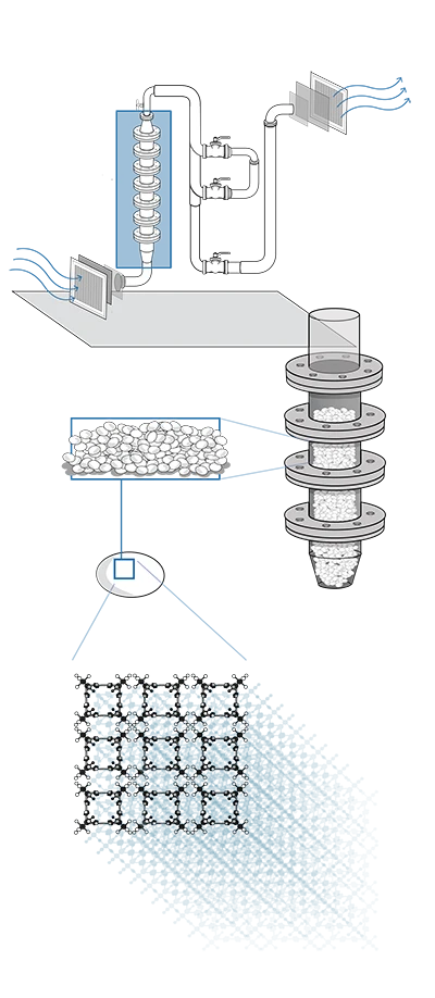 Air flows through a vertical reactor column engineered to maximize contact time and surface area for efficient CO₂ capture. Inside the column, airflow passes over dense, 4mm MOF pellets, creating a durable, high-performance capture zone designed for continuous operation in Alpine conditions.