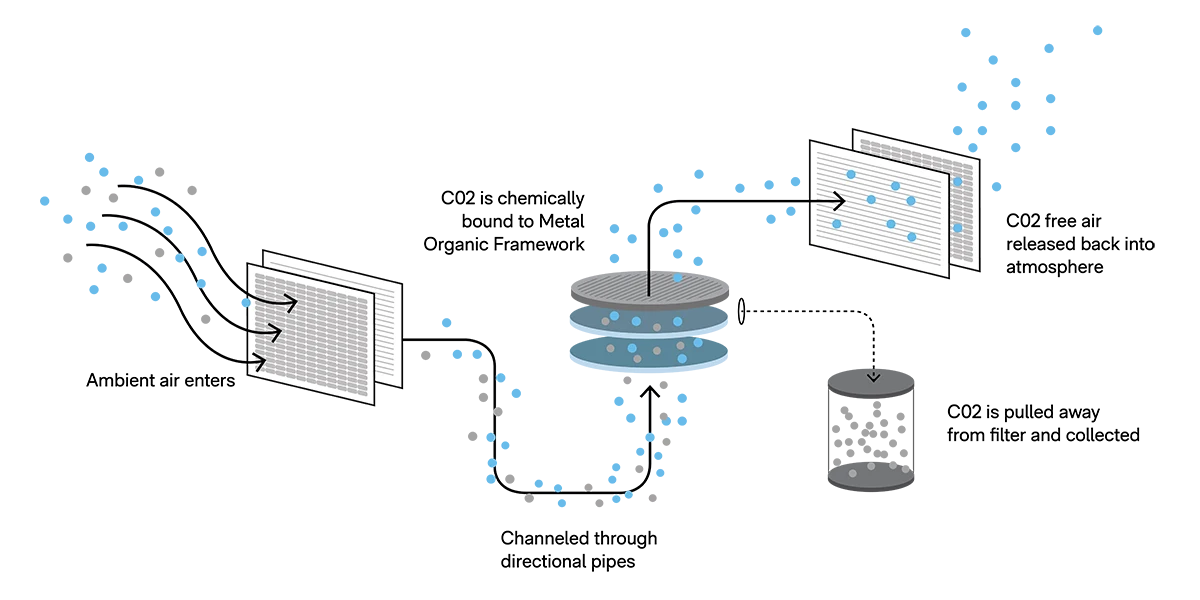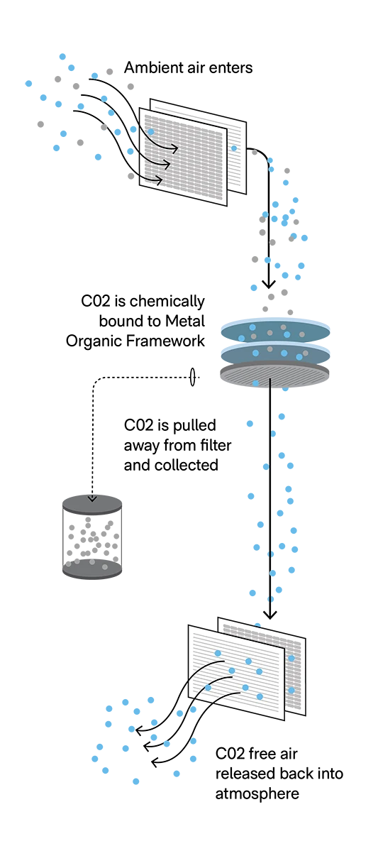 Direct Air Capture is a climate technology that removes carbon dioxide directly from the air. Large volumes of air pass through a solid material called a metal-organic framework, or MOF, which selectively captures CO₂ while allowing the rest of the air to flow through. A small amount of heat or pressure then releases the captured CO₂ for permanent storage or reuse, allowing the material to be used again.