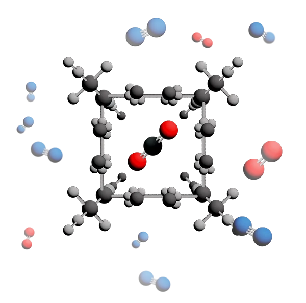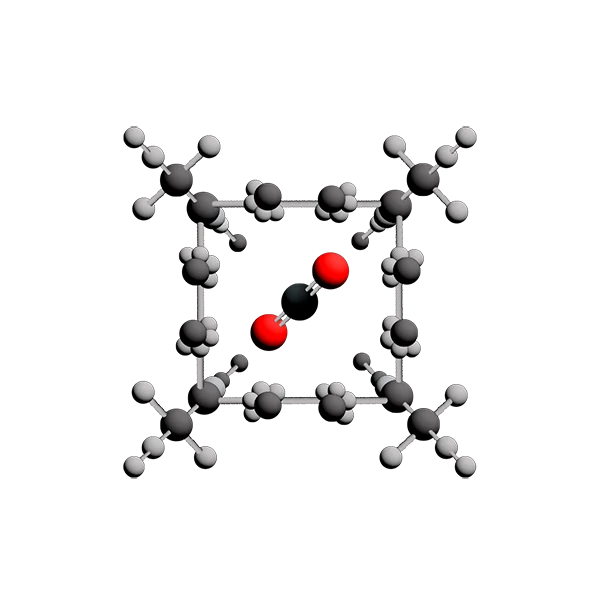 Inside the pore, the CO₂ molecule remains intact and is held in place by weak molecular interactions, allowing the framework to retain carbon dioxide without altering its chemical structure.